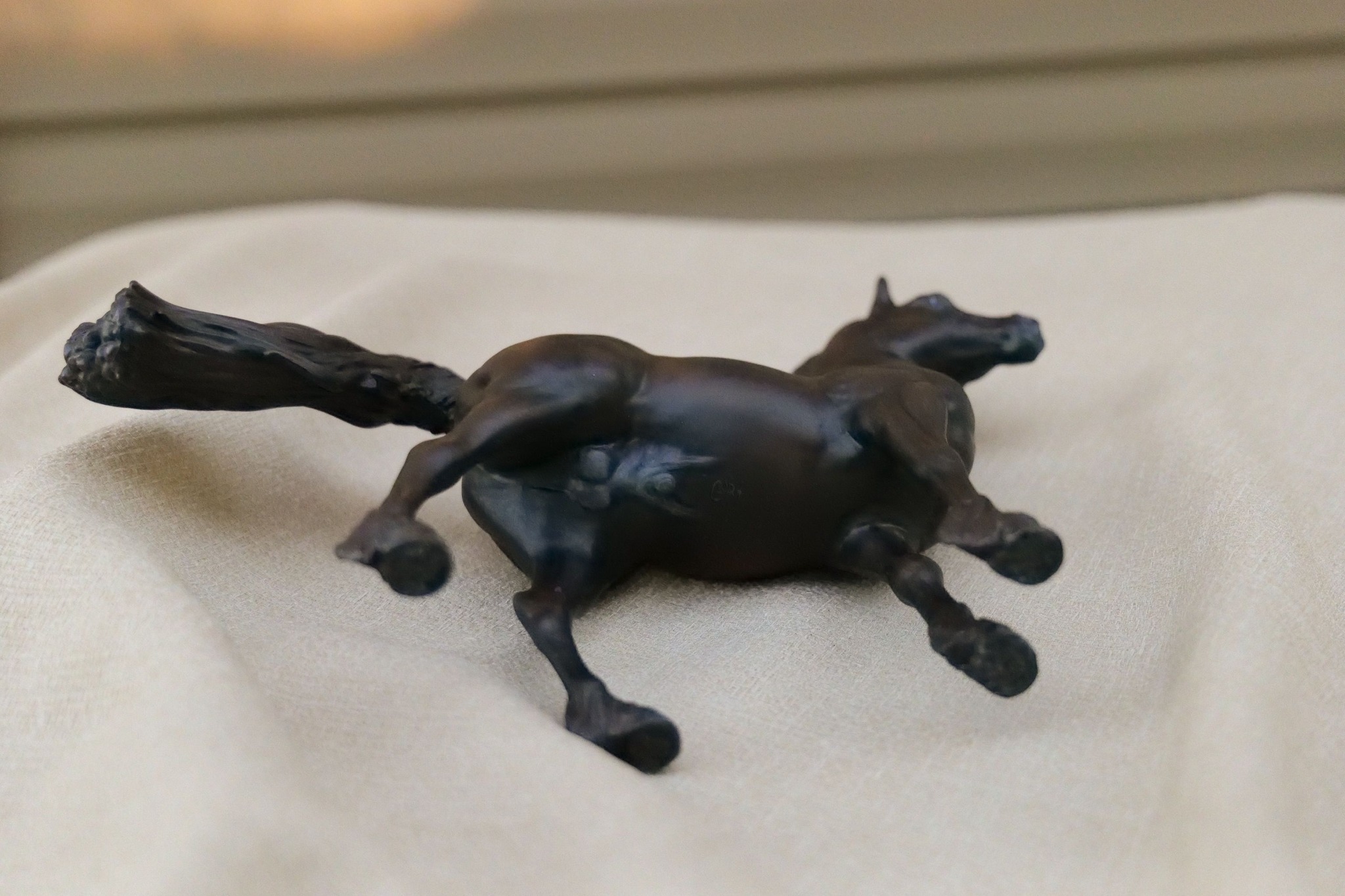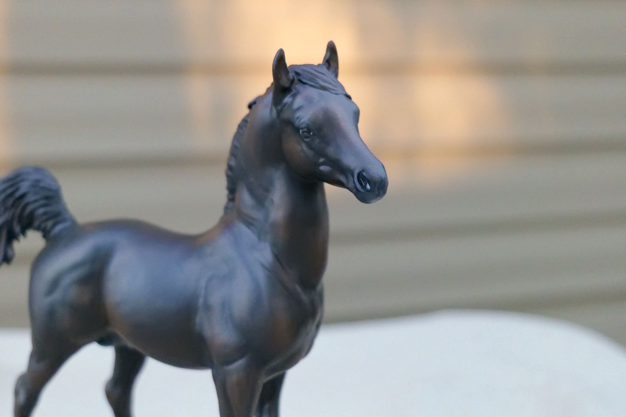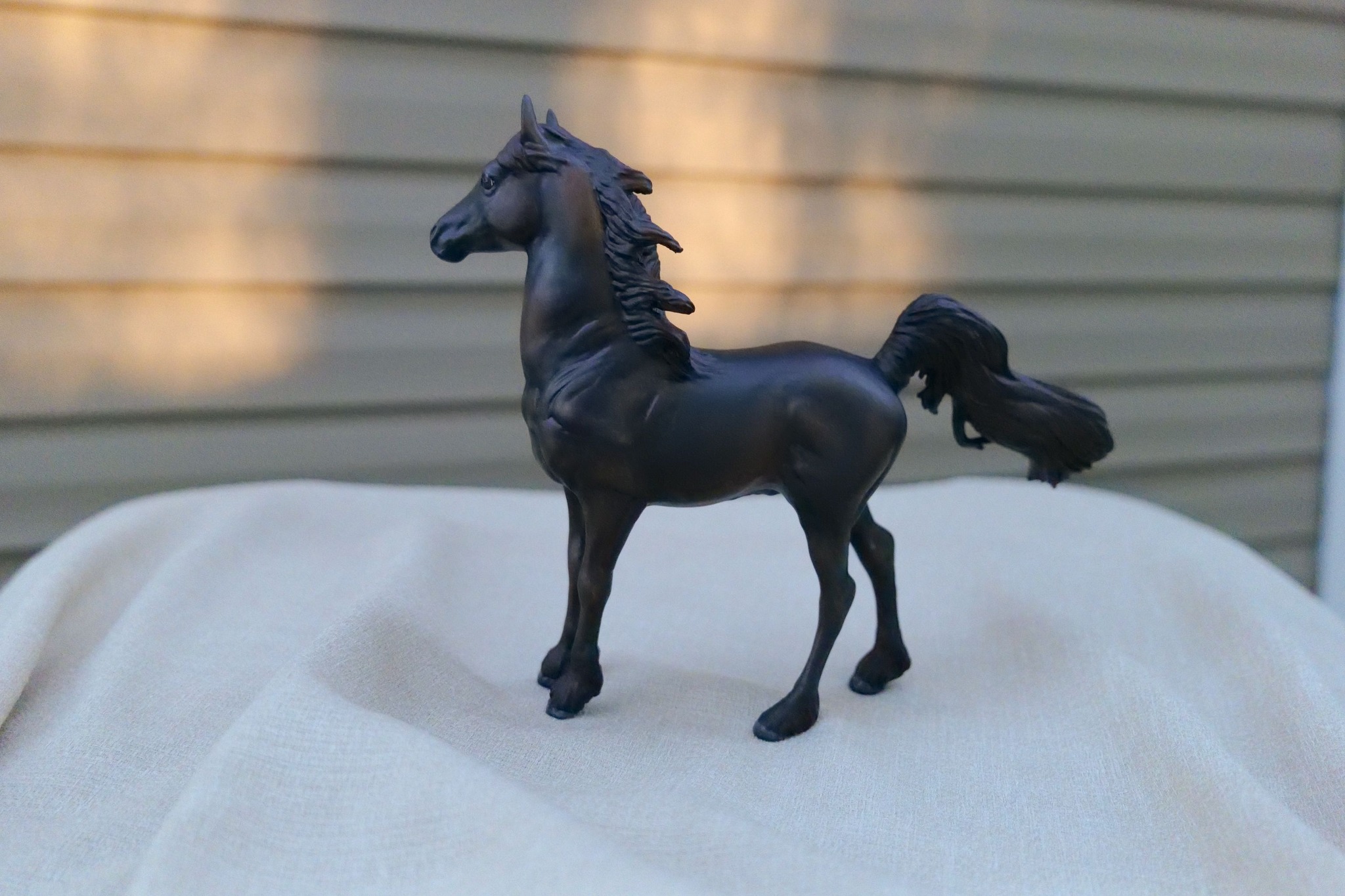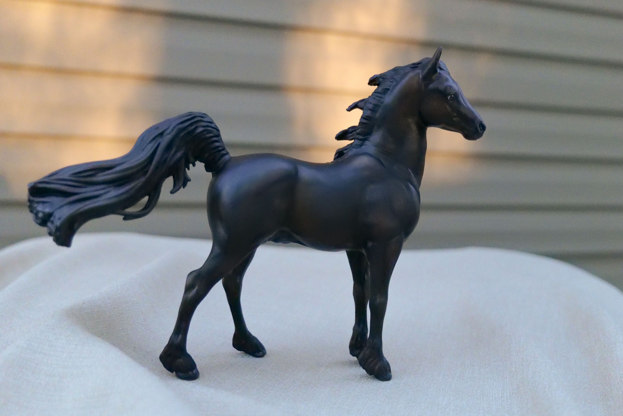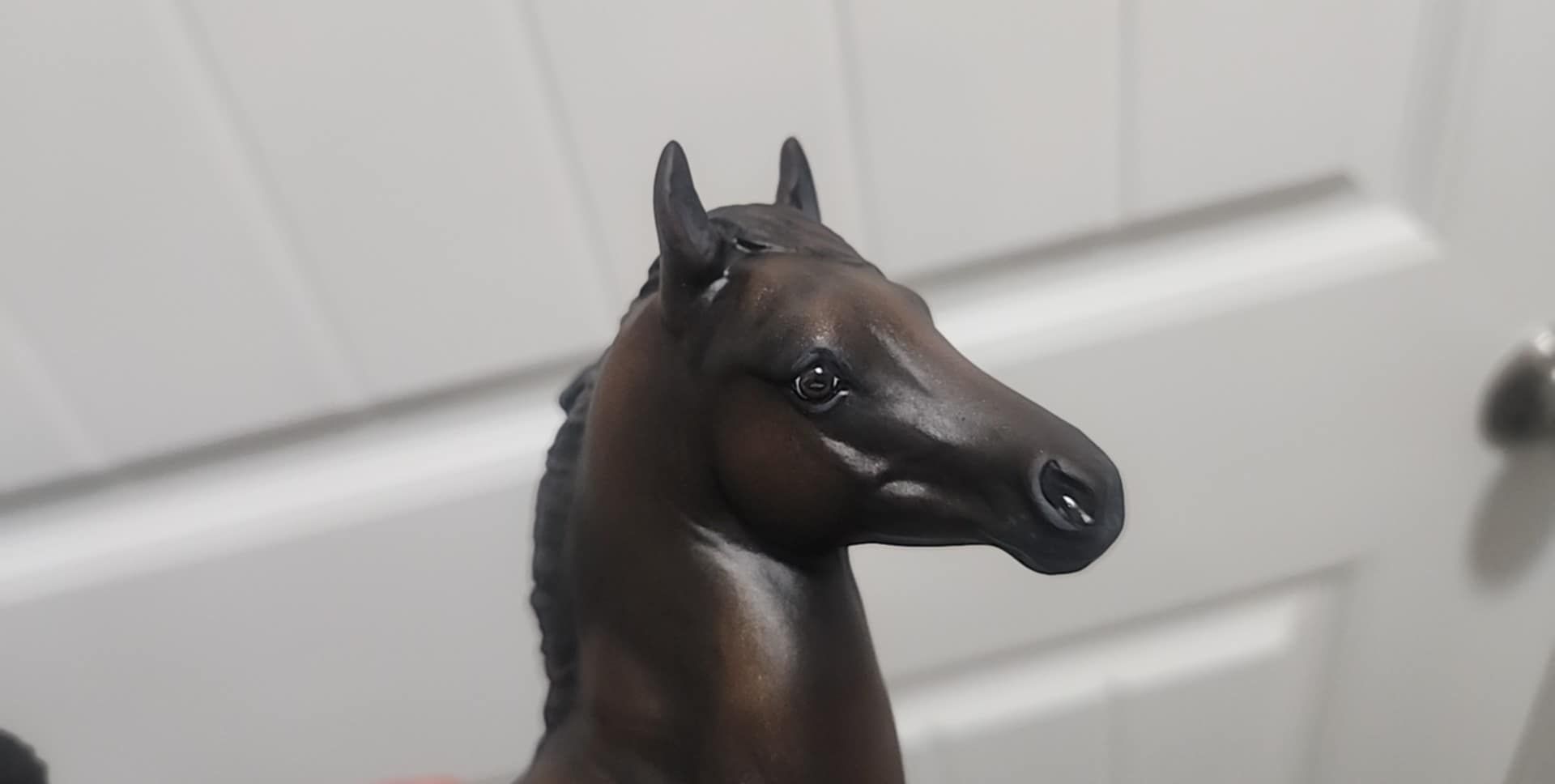 This was my 2025 NaMoPaiMo horse – he started off as a Breyer classic Arabian stallion. I replaced the mane and tail – the tail came from a Surfer’s Riptide. After a bit of mica and a LOT of depth creation, he was finished. Unfortunately, his depth is hard to capture on camera, but he has a slight sparkle and is black with brown shading. Here are a few mixed photos in different lighting to try to show that off.
