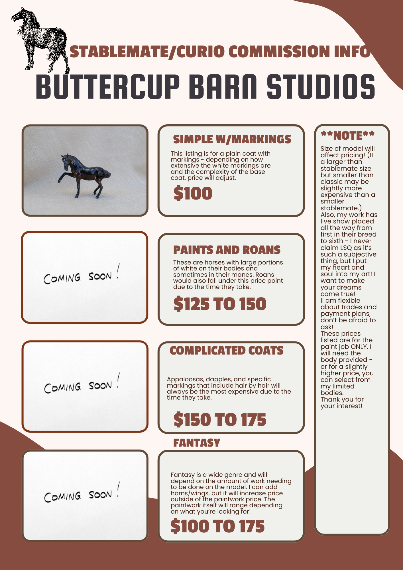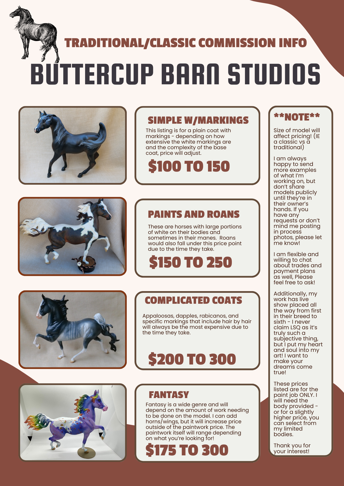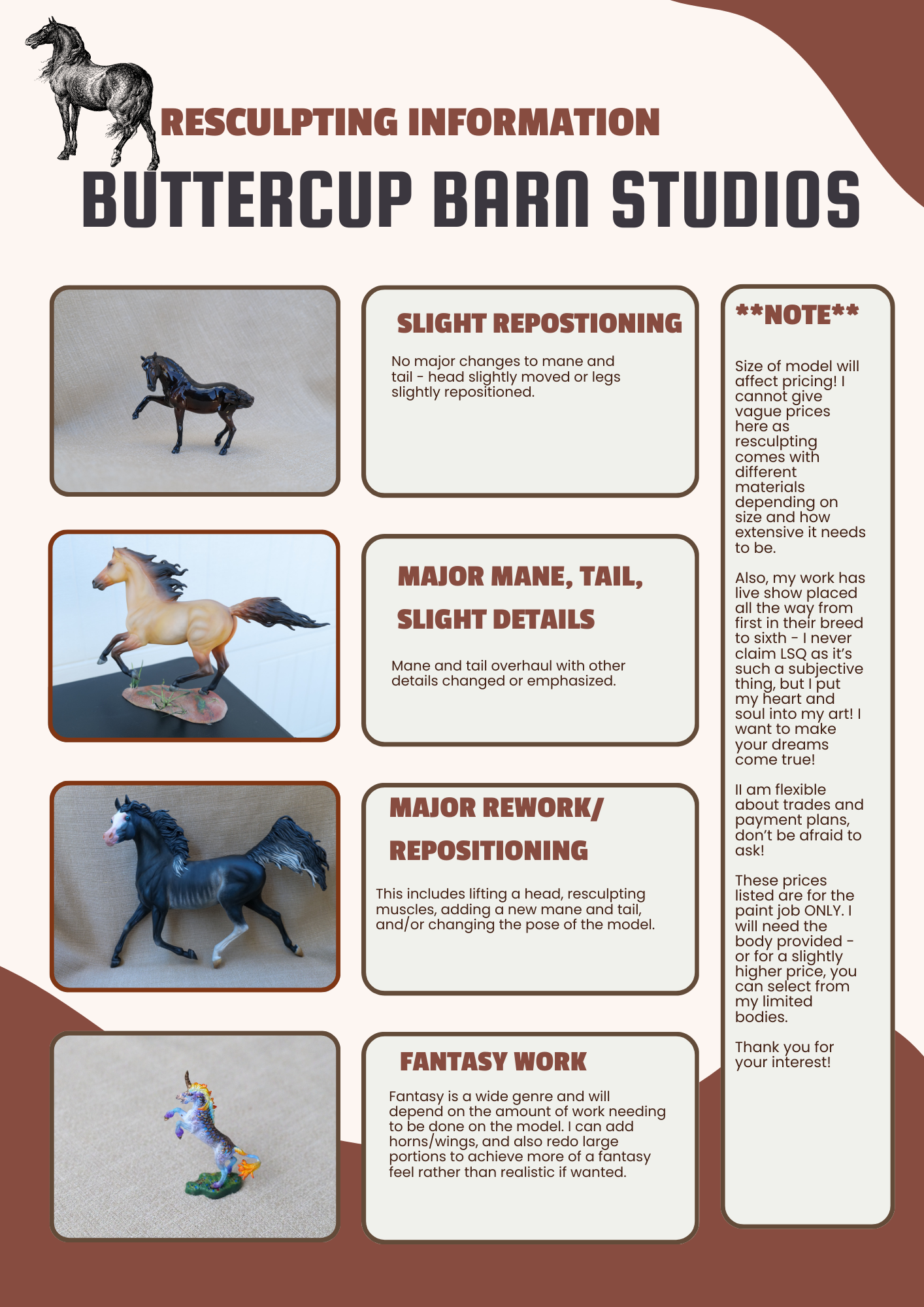 You’re in the right spot! 🐴 I’ve got open availability at the moment and would love to work with you. Below you’ll find my current pricing and offerings, including options for different scales, colors, and resculpting work. Everything’s laid out in the photos so you can find what best fits your needs – just click on them to enlarge to read!