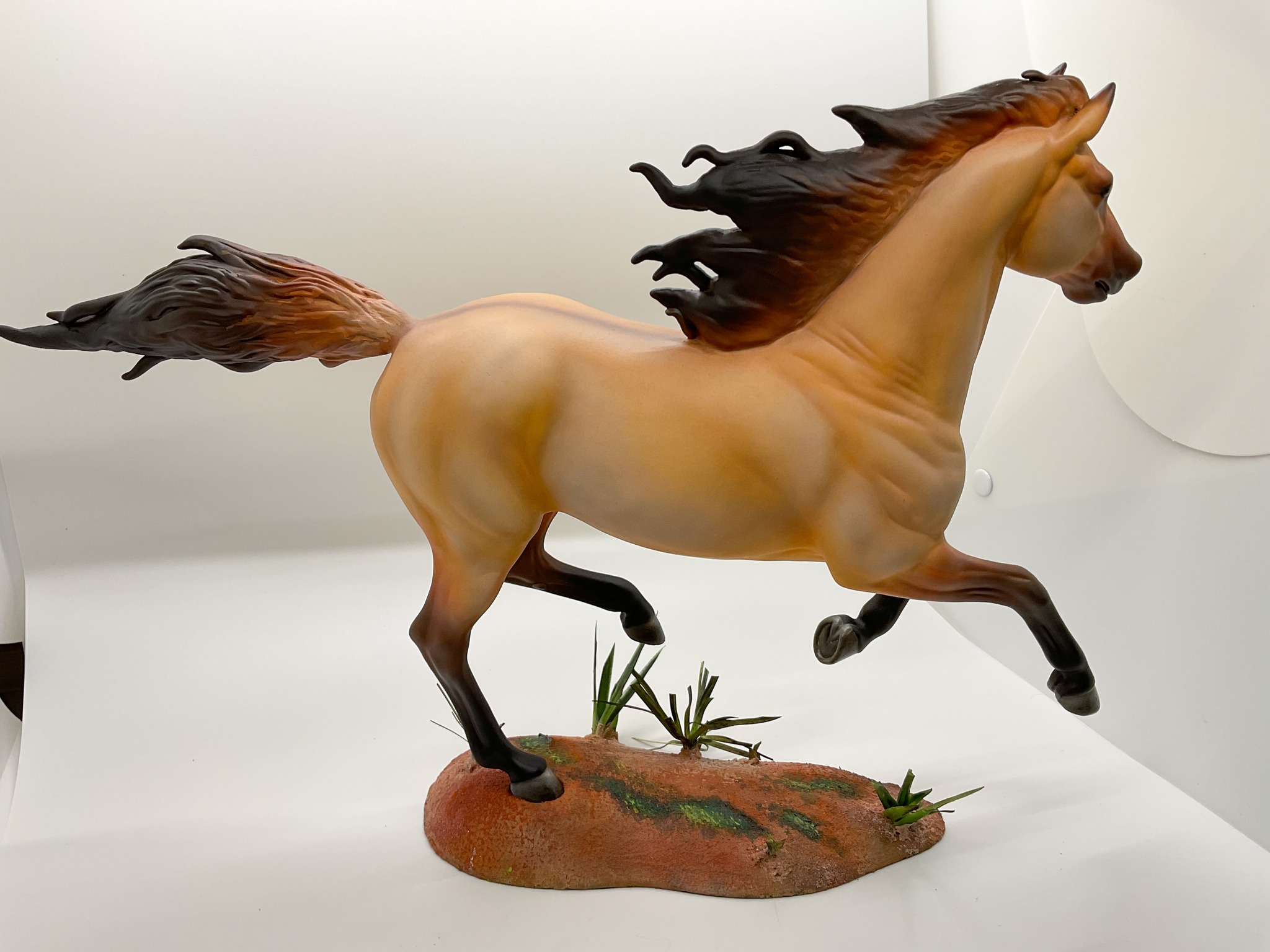 This custom started off as a Breyer Flexible Show Jumper. I slightly resculpted the face and did a complete overhaul of the mane and tail. A new paint job and some work on his base later and one of my favorite horse characters came to life!